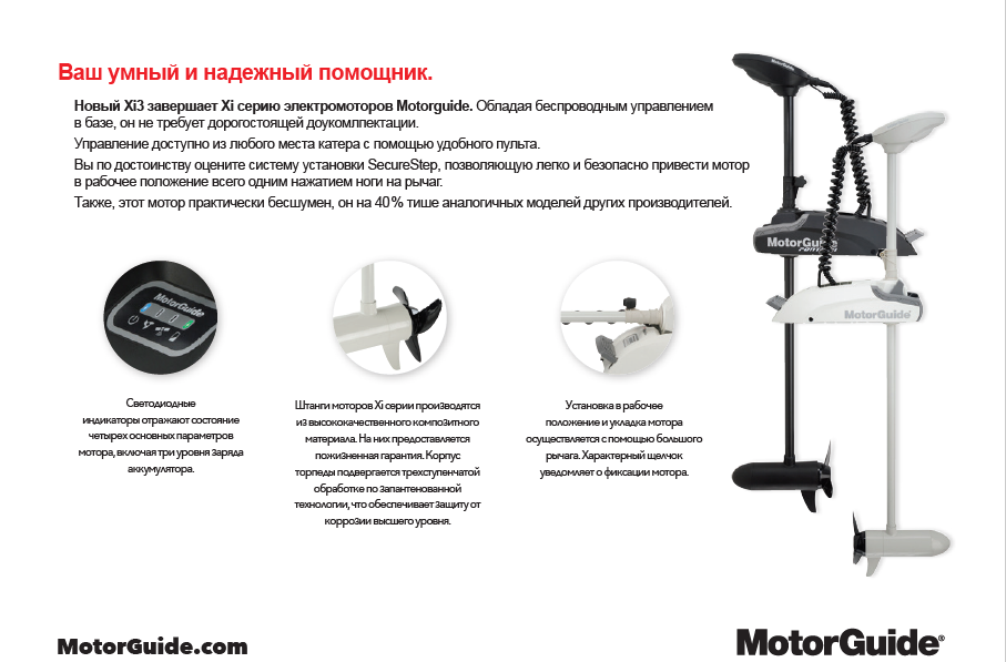 Новый MotorGuide Xi3-70 FW 60" 24V SNR/GPS - это самый тихий и простой в эксплуатации троллинговый мотор в своем классе. Звуковые тесты показали, что эта модель на 40% тише моторов в своём классе! Беспроводное управление и безопасная система установки и раскладки мотора SecureStep.