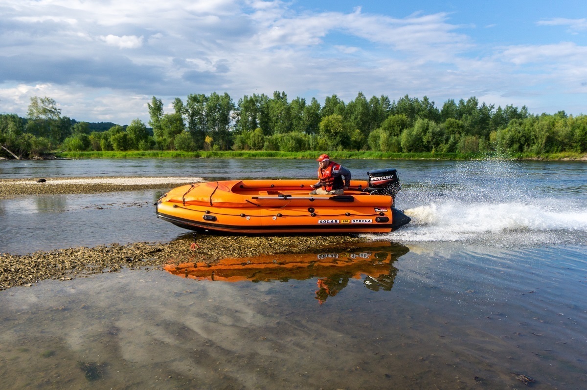 Уменьшенная ширина Solar - 470 Strela Jet Tunnel дает возможность значительно повысить ее маневренность при прохождении сложных порогов, а небольшой носовой киль дает возможность легко преодолевать шиверы с камнями и мелями, на которые так богаты наши горные реки.