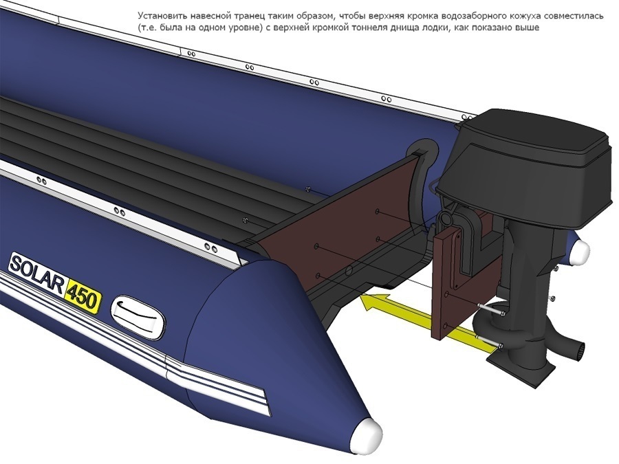 Solar-500 Jet Tunnel укомплектован накладкой на транец, для установки подвесного водометного двигателя на требуемую высоту именно под Ваш мотор. По нижнему краю расположен клапан для слива воды. Надувное дно расположено непосредственно под транцем, защищая его нижний край от повреждений о каменистое дно и берег.